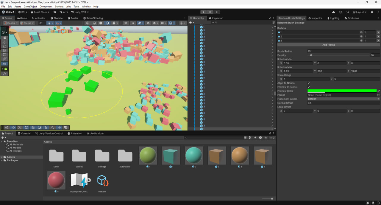 This tool enables fast and flexible prefab placement in Unity scenes using parameters like scale, rotation, density, and more.